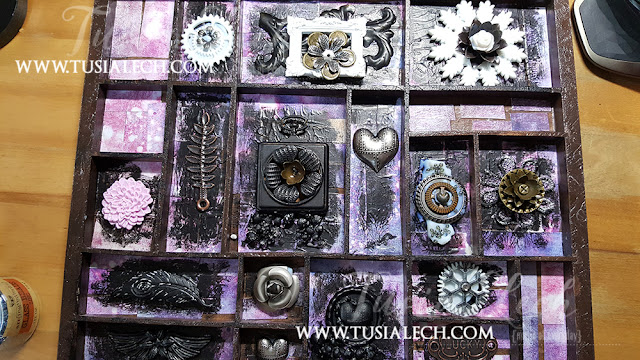 4. I have added more Mechanicals and some resin elements. When everything dried, I have covered everything again with black gesso and then I started applying Art Alchemy Metallic paints. Finishing touch was adding Art Alchemy Wax.